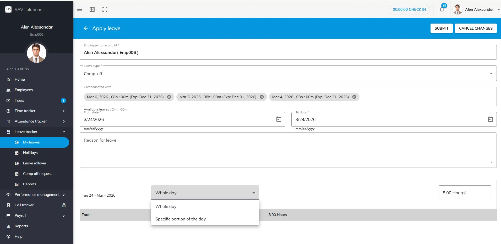 Step 6: The total comp-off hours being requested will be displayed automatically. Provide a reason for the leave application if required.