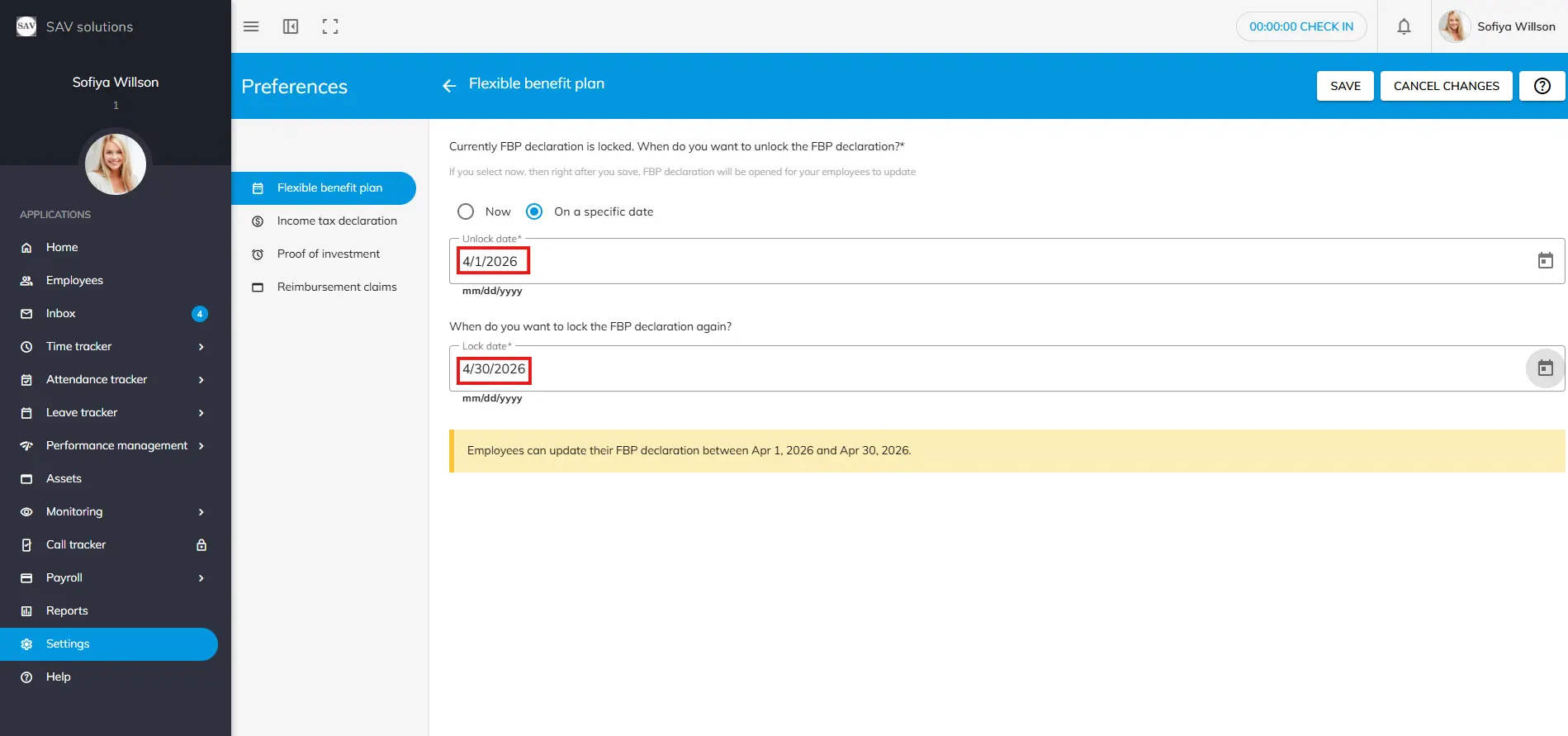 Example: If you set the lock date as April 30, 2026, employees will be unable to update their FBP declaration on or after that date.