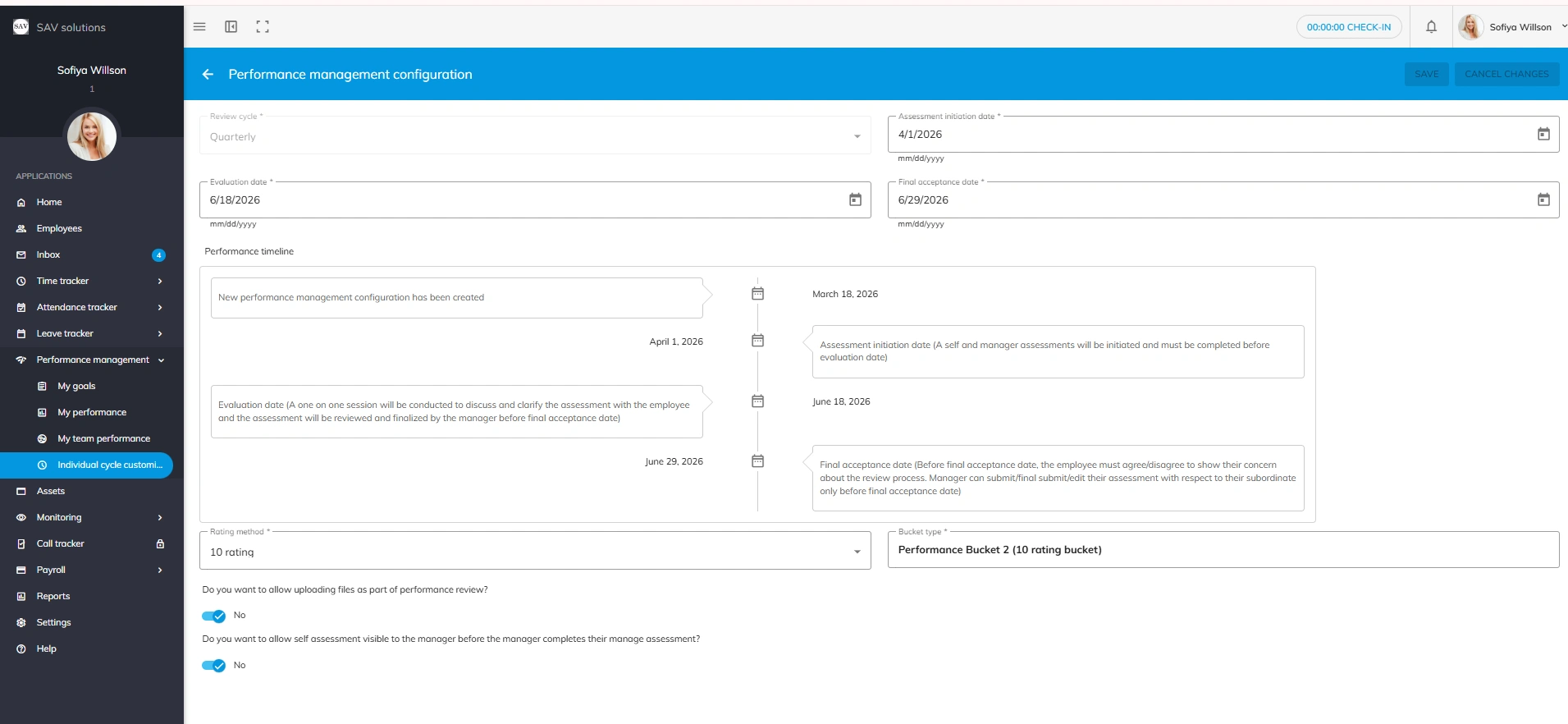 - Self-assessment visibility – Control whether the self-assessment is visible to the manager before they complete their assessment