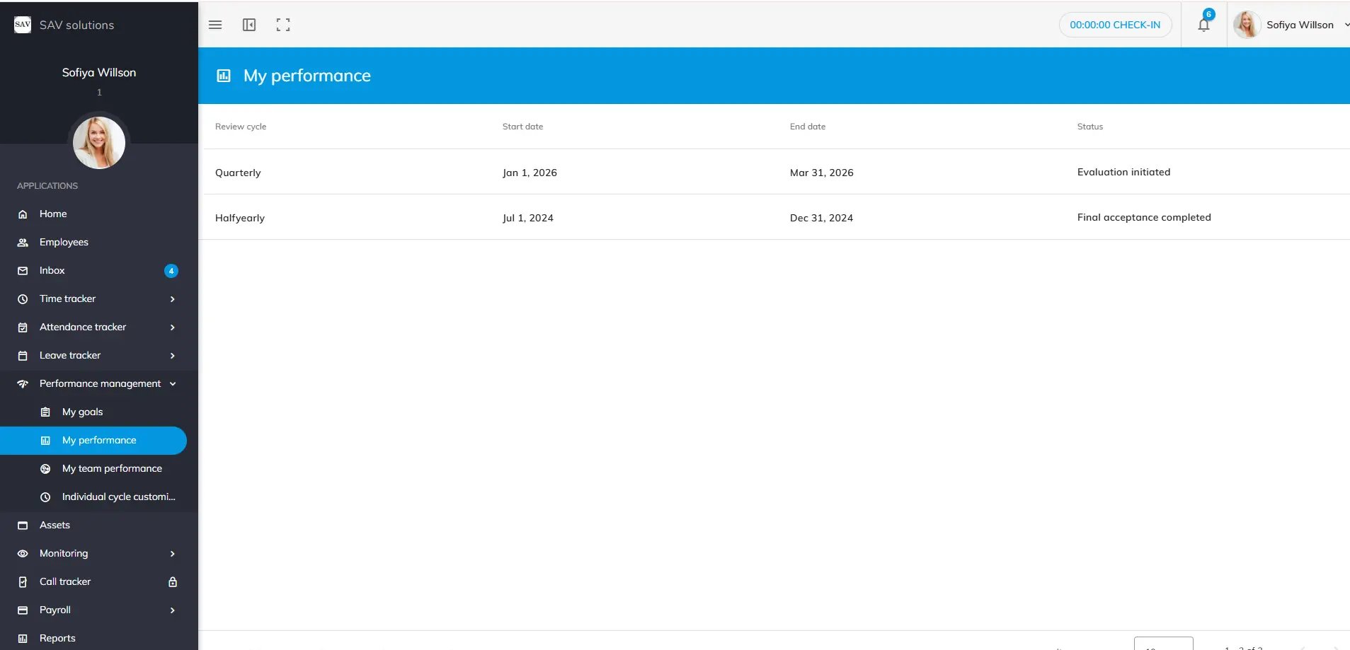 In the My performance section, you can view all the review cycles that happened in your organisation so far along with their start date, end date and status of the individual cycles. If you click inside any individual cycle’s status, you will see goals, menus and assessment details.
